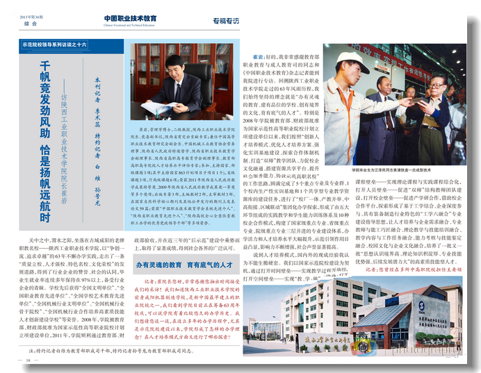 者:非常感谢您接受我们的专访。祝陕西工业职业技术学院乘示范院校建设之东风,乘风破浪,扬帆远航!