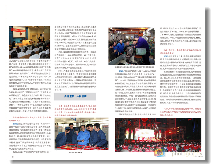 岩:首先,在示范建设过程中,我们深深体会到学院在示范院校建设过程中,最大的收获不仅仅是建成了西部地区规模最大、专业门类最全的高职院校,更重要的是带来了理念的提升,从某种意义上讲,这比国家资金性扶持更重要。通过项目带动,学院教师的教育教学理念、综合素质得以提升,更新了教育教学观念,提升了业务水平。国内外高职教育教学的新理念和经过培训的教师,成为学院发展的宝贵财富。