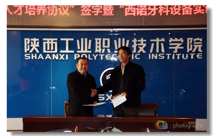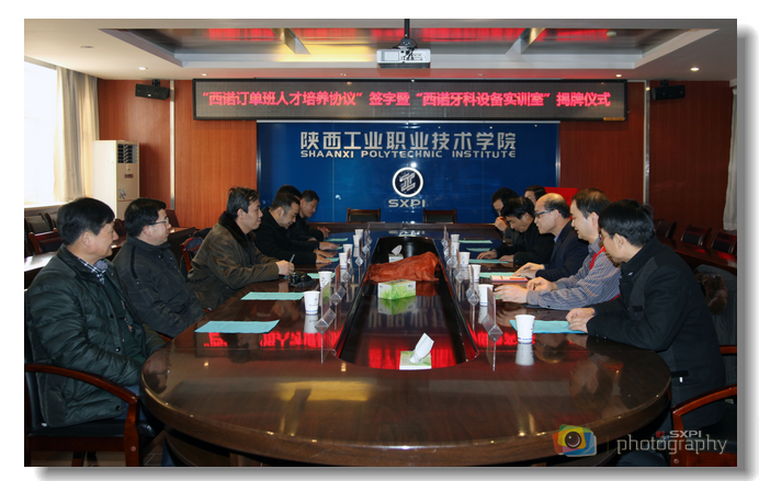 1月2日下午,陕西工院与西北医疗器械(集团)有限公司“西诺”订单班人才培养协议签字暨“西诺牙科设备实训室”揭牌仪式在崇文南楼第一会议室举行。西北医疗器械(集团)有限公司总经理李爱国、营销总监窦波、总经办主任聂西社、技术部副经理魏小峰、手机事业部制造部经理何林昌、总装车间主任刘登峰和陕西工院院长崔岩、副院长王晓江、教务处、数控工程学院相关负责同志出席,王晓江副院长主持仪式。
