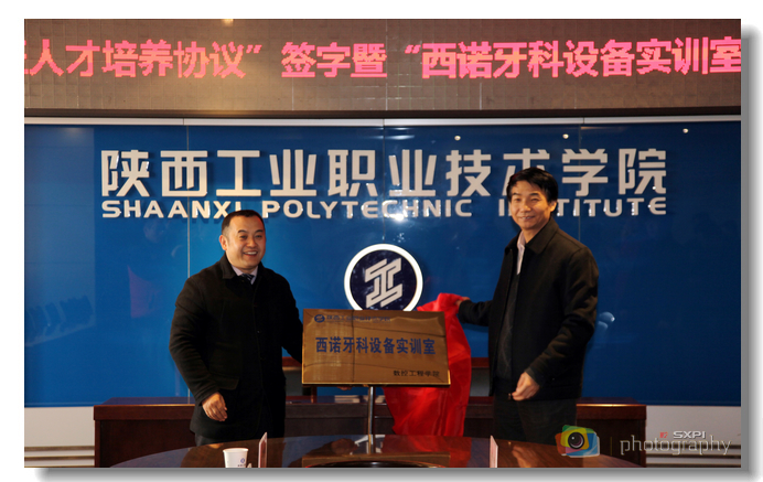 随后,崔岩院长与李爱国总经理代表双方单位签署人才培养协议书,并共同为“西诺牙科设备实训室”揭牌。